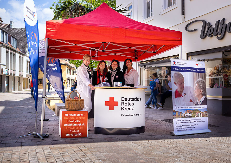 Mit einem gemeinsamen Infostand präsentierten die DRK-Schwesternschaft Rheinpfalz-Saar, der DRK Kreisverband Vorderpfalz und die DRK-Altenhilfe Vorderpfalz ihre Angebote den Bürgerinnen und Bürgern in der Neustadter Innenstand. Unter dem Motto „Immer gut versorgt in Neustadt“ gibt es ein vielseitiges Angebot – vom Hausnotruf über die ambulante Pflege mit Haushaltshilfen, das Betreute Wohnen „Seniorenresidenz“ bis hin zum Pflegeheim „Rotkreuzstift“ in einer ruhigen Wohngegend von Neustadt.