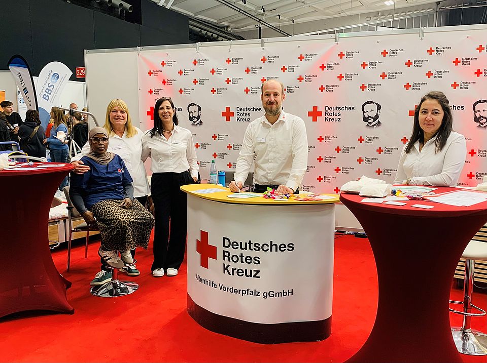 Ob Ausbildung, Freiwilligendienste oder schnellen beruflichen Einstieg durch Weiterbildung: Bei der zweitägigen Messe für Ausbildung und Studium „Sprungbrett“ in der Friedrich-Ebert-Halle konnten die Besuchenden in die Welt des Roten Kreuzes eintauchen. Die DRK-Altenhilfe Vorderpfalz präsentierte sich als attraktiver Arbeitgeber. „Ob eine Ausbildung in der Pflege, im Bereich Bürokommunikation und Gesundheitswesen oder ein Duales Studium in der Pflege – wir bieten vielseitige Wege zum Start in die Berufswelt an“, erklärte Alexandra Accardo, Personalleitung der DRK-Altenhilfe Vorderpfalz. Aber auch ohne einen Schulabschuss gibt es beim DRK durch Weiterbildung einen Einstieg in die Pflege. „Mit unserem AZAV-zertifizierten Kurs zum Pflegehelfer mit interkulturellem Fokus qualifizieren wir in 200 Unterrichtseinheiten Theorie und 160 Stunden Praxis Menschen ab 18 Jahren ohne Schulausbildung in Teilzeit zu Pflegehelfern. Der Kurs, der im Januar 2026 startet, kann vom Jobcenter oder der Agentur für Arbeit gefördert werden“, ergänzte Christina Jost-Mallrich, Pädagogische Leitung der DRK-EDUcare Vorderpfalz.